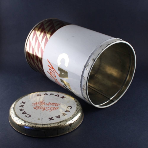 デンマークのコーヒー会社、Cafaxのキャニスターです。ゴールド・赤茶・白の色合いが良くマッチしています。キッチンに飾っておくだけでも、素敵なインテリアになりそうです。キャニスター全体にさびが目立ちます。