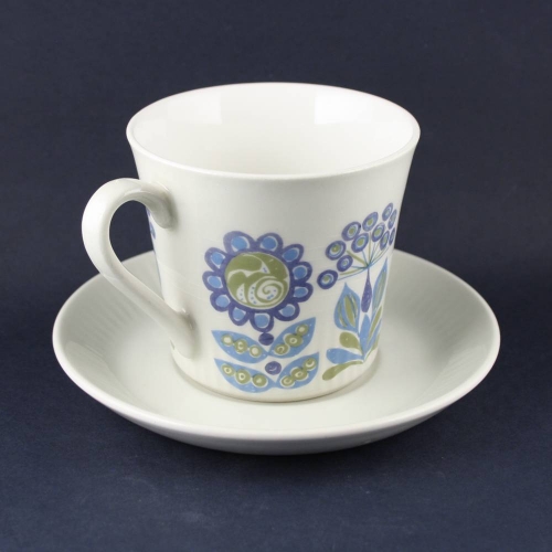 Turi Gramstad Oliverデザイン、ノルウェーFiggjo(フィッギオ)社のカップ&ソーサー、大きいサイズです。Tor Vikingシリーズ。かわいい花のイラストが青と緑の色彩で描かれています。カップの外側と内側底に貫入か見られますが、ひび・欠けなく全体的にきれいなコンディションです。カップの大きさ:9×9cm 高さ:8cm