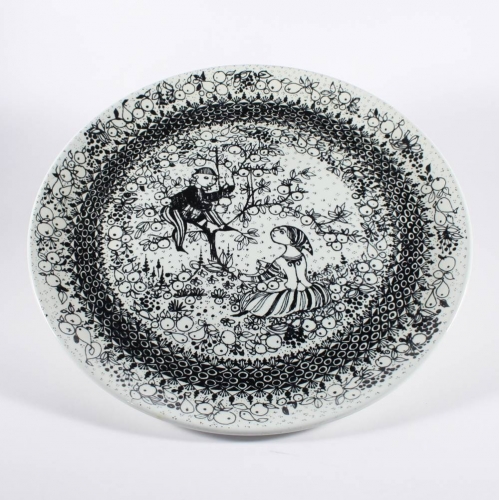 Bjørn Wiinblad イラストによる Nymølle社の大皿です。四季を描いたシリーズのうちの “ 秋 ” です。男女が仲良く、梨を摘んでいる秋らしいイラストが描かれています。壁掛け用の穴があいています。ひび・欠け・貫入なく、とてもきれいなコンディションです。