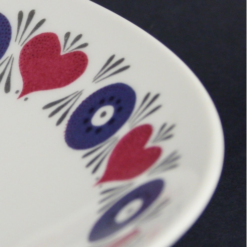 スウェーデンRörstrand社(ロールストランド)、Siljaシリーズのスープ皿です。濃いピンクのハートと青いマルが目に焼き付く、ポップでかわいいデザインです。良く見ると小さいペイントロスが見られますが、ひび欠けなどなく良いコンディションです。製造された年代により商品のバックプリントが異なる場合があるので、決まったバックプリントをお求めの際には、ご購入前にメールにてご連絡ください。